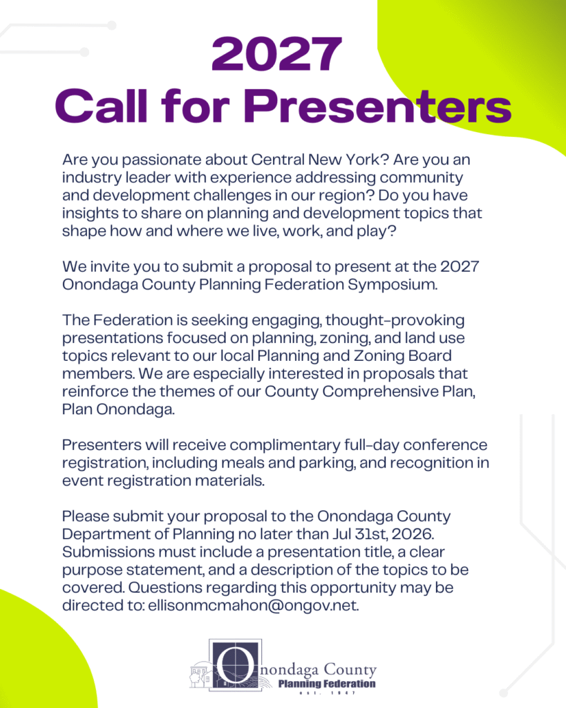 The Onondaga County Planning Federation (OCPF) is a nonprofit corporation that serves every municipality in Onondaga County by hosting annual training conferences for elected and appointed local officials and the public, and providing trend data and planning information to Federation members. The Onondaga County Department of Planning provides staff services to the Onondaga County Planning Federation.